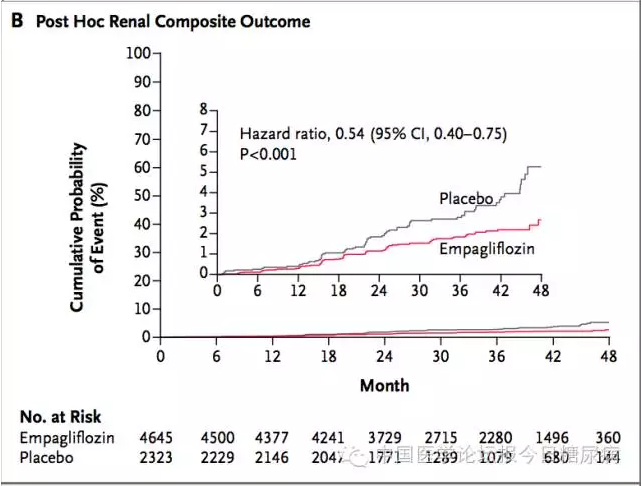 3.开始肾脏替代治疗者在恩格列净组和安慰剂组分别为0.3%(13/4687)和0.6%(14/2333),恩格列净与安慰剂组相比可降低相关风险55%;