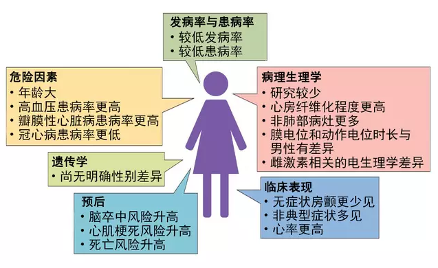 在北美和欧洲人口中,与男性相比,女性总体上有着更低的经年龄校正后的发病率和患病率,男性可为女性的 1.5~2.0 倍。但鉴于女性平均寿命更长,男女患房颤的终生风险相近。