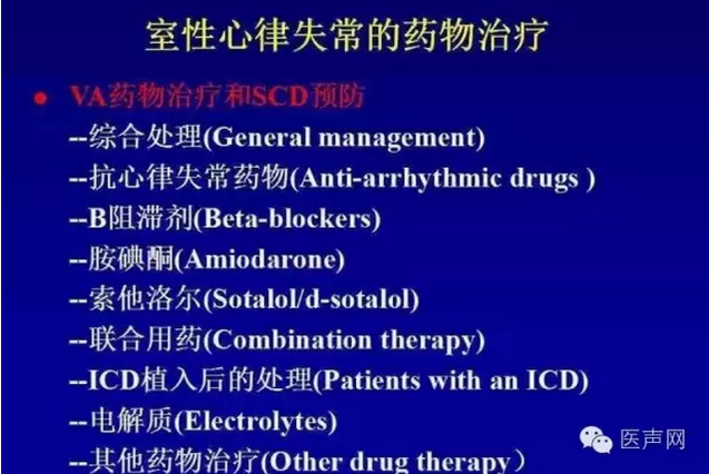 谈到药物治疗,王祖禄教授说,室性心律失常的药物很多,但越多越说明没有什么好的办法。系列研究表明,药物治疗的结果总体上是让人十分失望的。药物治疗可能降低室早,但并没有能够降低死亡率,甚至因为血流动力学恶化——缺血事件增多、心衰等,可能增加死亡率。