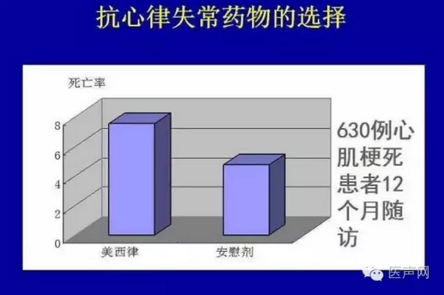 在对630例心肌梗死患者12个月随访研究发现,用了美西律的患者死亡率甚至高于安慰剂的治疗。王祖禄教授说,因此,有些药物虽然可以用,但不能期望值太高。