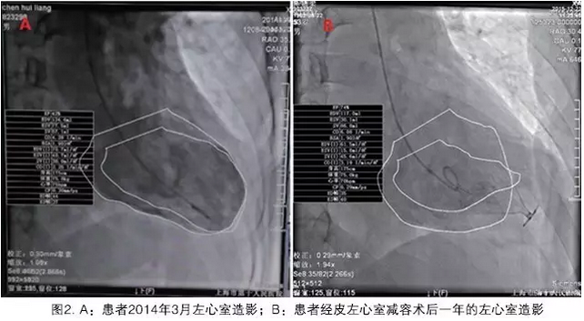 患者术后恢复良好,术后一周伤口稍有渗漏,处理后愈合良好。术后7天复查左心室彩超,LVEF就已经提高至36%,术后一年心脏彩色多普勒超声示装置锚定良好,未见移位,左心室射血分数35%,封堵伞四周未见反流。2015年12月22日患者复查冠脉造影及左心室造影,如图(图2),患者左心室射血分数明显提高,除室壁瘤外的左心室心肌收缩力明显变强。左心室心输出量自4.28 L/min提高至6.08 L/min。患者自述胸闷症状明显好转,偶感胸部有异物感。