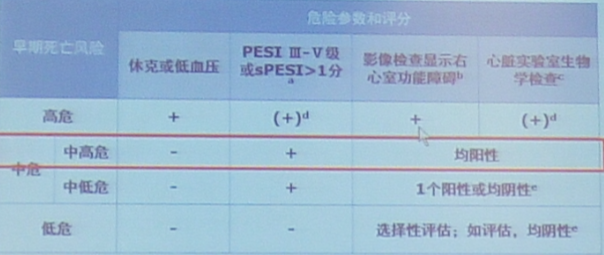 根据PESI或sPESI划分中危和低危,并根据影像学和生物学结果对中危进一步细分: