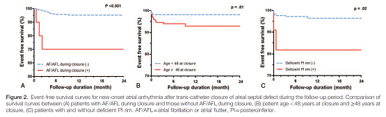 更值得注意的是,部分房间隔缺损患者在接受外科矫正手术或介入封堵治疗后,仍有8%-11%的患者可能出现房颤。缺损越大、年龄越大、肺动脉压越高以及并存甲状腺和二尖瓣疾病时,房颤发生的几率便越高。Park等通过随访研究发现,ASD介入术中一过性房扑/颤、房缺的后下边缘较短以及年龄大于48岁都是ASD术后新发房颤的预测因素(图1)。