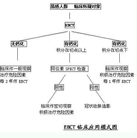 EBCT检出冠状动脉钙化只是表明冠状动脉的病理改变,其临床意义应根据具体病例的临床症状、心电图、冠心病危险因素、年龄及性别等具体分析。EBCT检查冠状动脉钙化临床应用模示图如下,供参考。