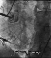 一例63岁男性因“气促”入院。既往有高血压、卒中和酒精滥用史。入院时心率120次/分,颈静脉充盈,第一、第二心音规则,胸骨左缘可闻及Ⅲ~Ⅳ级全收缩期杂音,吸气时增强。超声心动图提示弥漫性左室运动功能减退,室间隔远端节段性无运动。LVEF为30%。心导管检查未显示冠脉闭塞,而发现在RCA和右室之间存在一处2 mm长的瘘道(如图)。
