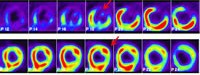 图1 上排:左室前壁心肌血供中断(箭头所示),前壁心梗;下排:前壁梗死的心肌糖代谢旺盛,提示心肌存活。