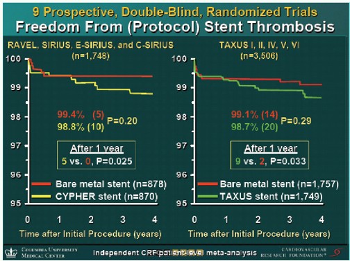 由于波士顿科学公司原来的支架血栓定义在ARC定义之前是所有DES临床研究中入选标准最宽的(与目前的ARC定义非常接近),所以今年的TCT上由全球知名学者——美国心血管基金会主席Dr. Stone 教授公布了由美国心血管基金会(CRF)独立分析数据TAXUS临床研究项目TAXUSI,II,IV,V,VI荟萃分析 (n=3506),四年结果显示包括一年以后的支架超晚期支架血栓与先前公布的临床结果一致;而Cypher支架的临床研究项目REVAL,SIRUS,E-SIRUS,C-SIRUS荟萃分析(n=1748),四年结果显示Cypher支架组的一年以后的超晚期支架血栓与裸金属支架组有显著性差异,P=0.025(见图一),与刚在9月ESC上公布的结果不一致 。