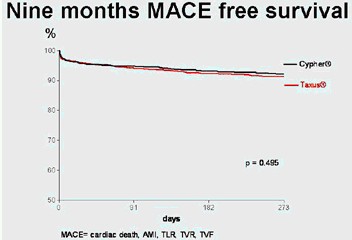 “There was almost no difference between the nine-month MACE-free survival curves,” reported Dr. Galloe. Proportionally, 7.8% of patients in the Cypher arm and 8.6% of the Taxus group experienced a MACE event by nine months, a nonsignificant absolute difference of only 9 events/patients or 0.8%.