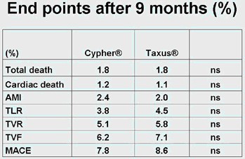 华盛顿讯——在最大的一项雷帕霉素洗脱Cypher支架和紫杉醇洗脱Taxus支架直接对比研究中, 主要研究终点——9个月的临床或患者驱动的MACE发生率并没有显著性差异。