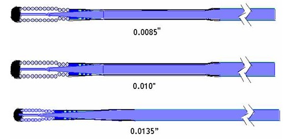 1. 核心钢丝支撑段直径的变化控制着导丝的线性柔顺性/线性支持力度(横向支持力)。直径减小支持力降低,而柔顺性增强,拉直血管的可能性较小,跟踪能力提高。直径增大支持力变强,拉直血管的可能性增大,但顺应性减低(图5)。