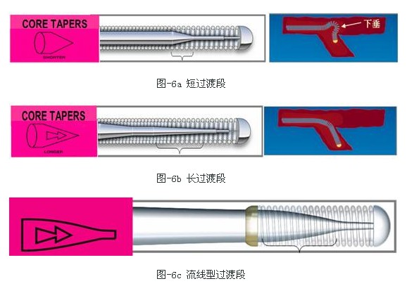 2. 核心钢丝过渡段的长短及形态决定了导丝的不同特性。短过渡段设计获得了稳定的支持力,但降低了导丝的顺应性,增加其下垂倾向。对导丝头部走向的可控性降低,使其不易通过扭曲、成角的血管(图-6a);长过渡段的设计增加了导丝的顺应性及跟踪性,使其不易产生下垂。更容易通过极度扭曲的血管及侧枝血管(图-6b);而新型的流线型过渡段设计使导丝的支持力得到进一步的改善,跟踪性也得到进一步的优化(图-6c)。