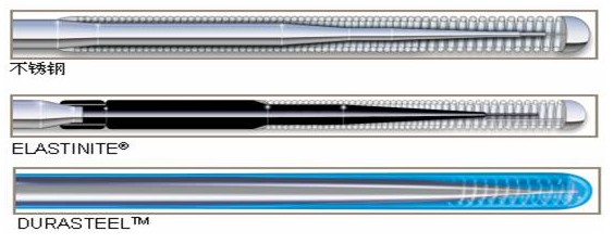⑷ 核心钢丝的材质不同决定着导丝的强度、耐用性和柔顺性的不同。为改善导丝顺应性、支持力以及提高其耐用程度,拓宽导丝针对不同冠脉病变的应用范围,各公司对核心钢丝的传统不锈钢材质进行了不断改进,以Boston公司的PT2系列导丝、Abbott Vascular公司的High Torque系列导丝及Whisper、Pilot系列导丝采用了镍钛记忆合金(elastinite)及新型不锈钢(durasteel)材料作为核心钢丝(图-7)。镍钛记忆合金的应用使导丝具有更好的弹性、灵活性和伸缩性,在复杂血管病变中应用不易变形,耐用性良好,兼具有优异的顺应性及支持力。新型不锈钢材质较普通不锈钢材料具有更好的操纵性及跟踪性。