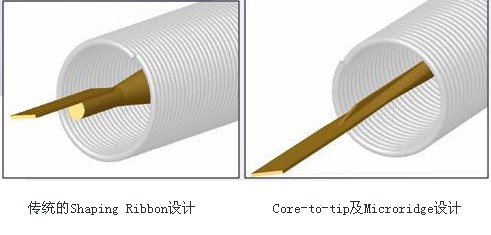 1. Soft floppy-tip设计:其核心钢丝远端靠一根细钢丝与导丝的帽端连接,此种设计增加了导丝的柔软性,适合扭曲、成角病变,对血管的损伤小,但操控性及通过能力较差。Abbott Vascular公司的FloppyⅡ系列、BMW系列导丝属于此类导丝。