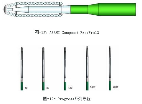 针对闭塞病变的不同特点一些公司设计出专门用于CTO病变的新型导丝。以Abbott Vascular公司的CROSS IT系列和ASAHI公司的Conquest系列导丝为代表(图12)。导丝尖端设计成锥形头端,锥形尖端的直径分别为0.010英寸和0.009英寸,其内部结构仍为Core-to-tip设计,随导丝标号的增加,其尖端硬度增强。