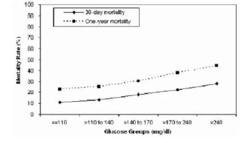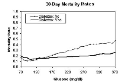 Framingham研究早在30余年前既已证明,糖尿病患者发生心血管事件(包括全因死亡、心血管死亡和心肌梗死)的危险较非糖尿病患者高2~4倍。Kosiborod等2005年发表在《循环杂志》上的一项迄今为止最大规模的回顾性研究对141 680例老年急性心肌梗死(AMI)患者进行了观察,结果发现,糖尿病患者30天死亡率显著升高13%~77%,1年死亡率显著升高7%~46%,且死亡率增加与血糖升高水平呈正相关(图1-2)。其他许多关于ACS的大型临床研究(如CREATE-ECLA、HI-5等)结果类似。
