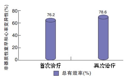 上海长征医院心内科廖德宁、赵伟、吴宗贵等进行了自身对照研究(图2)。结果显示,参松养心胶囊首次治疗和再次治疗对患者非器质性室早和心率变异性的总有效率分别为76.2%和78.6% 。