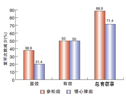 对室早的疗效(图3) 参松养心胶囊治疗室早的总有效率为88.9%,显效率为38.9%,美西律治疗组分别为71.4%、21.4%。参松养心胶囊显著优于美西律(P<0.05,P<0.01)。