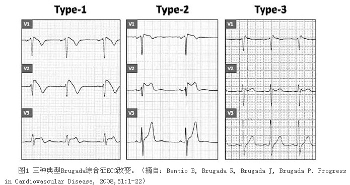 BS根据ECG异常分为三种类型(图1),Ⅰ型:右胸导联ST段明显抬高,呈穹隆形, J波或ST段抬高≥2mm,伴随T波倒置,其间极少或无等电位线; Ⅱ型: ST段抬高, J波≥2mm, ST段逐渐下降,但仍在基线上≥1mm, T波正向或双向,呈马鞍形; Ⅲ型: ST段抬高<1mm,呈穹隆形及(或)马鞍形。这三种类型的ECG表现不是孤立和绝对的,随时间变化或在药物的作用下或机体内环境变化的影响下三种类型可以相互转变。
